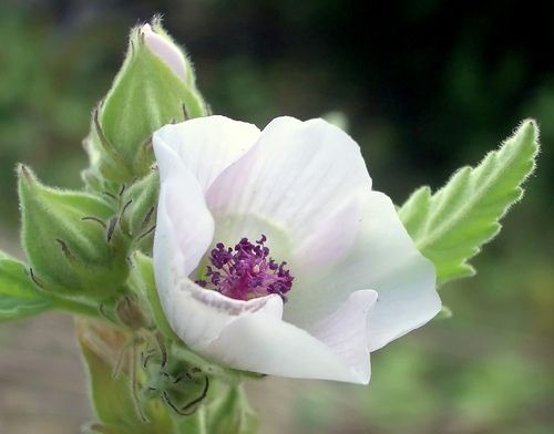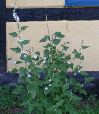 Многолетник семейства мальвовых, с серыми, как будто пепельными листьями. Растение высокое до 1,5 м высотой. Корни светлого желтого цвета. Листья очередные с черешками, с бархатистым опушением, сердцевидной формы. Цветы располагаются в пазухе листьев и на верхушке растения, белые или розоватые с пятью лепестками. Период цветения с июня до сентября.