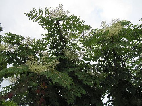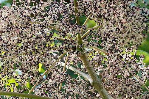 Невысокое дерево с мощными корнями, ствол неветвистый покрыт многочисленными шипами. Листья большие, могут достигать 1 м в длину, перистосложные, собранны в мутовки на верхушке ствола. Цветы маленькие, невзрачные, серо-белые, собраны в шаровидные зонтичные соцветия, которые образуют сложную метелку. Плод сочная костянка, черная с пятью косточками.
