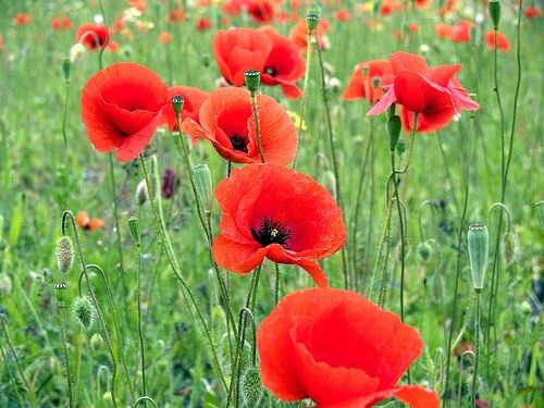 Цветы крупные одиночные, расположены на верхушке стебля или ветвей на длинном цветоносе, длина цветоноса может достигать 25 см. Бутоны поникающие, длина бутона до 2,5 см. Каждый цветок имеет два зеленых чашелистика, покрывающих бутон и опадающих при распускании цветка. Венчик до 10 см, состоит из четырех крупных овальных лепестков ярко-красной, реже белой или розовой расцветки, обычно с большим черным пятном у основания венчика. Тычинки многочисленные. Плод - обратнояйцевидная коробочка длиной от 1 до 1,5 см. Семена мелкие, гладкие многочисленные.