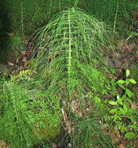 Многолетнее споровое травянистое растение из семейства хвощовых. Стебли имеют две генерации - весеннюю (спороносную) и летнюю (бесплодную). Весенние побеги невысокие (10-25 см), не ветвистые, красновато-белые, сочные, заканчивающиеся спороносным колоском. Они появляются в апреле - мае, в июне вырастают бесплодные (вегетативные) побеги, зеленые, бороздчатые, высотой 10-50 см, напоминающие молоденькую сосенку. Ветви в мутовках (по 6-8), направленные косо вверх.