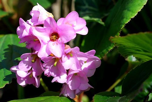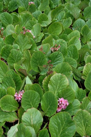 Невысокий травянистый многолетник с мощным ветвистым стрежневым корневищем, достигающим значительной длины, желто-бурого цвета. Листья образуют густую прикорневую розетку, крупные до 35 см длиной, с длинными широкими черешками, листья кожистые темно-зеленые, гладкие и блестящие, край листа слегка зубчатый, зимующие. Соцветие сложная метелка, расположенная на высоком цветоносе. Цветы лилово-розовые, розовые или белые; плод-коробочка.