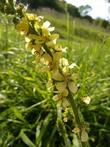 Цветки, окрашенные в золотисто-желтый цвет, имеют приятный аромат и собраны в соцветия типа колосс. Интенсивно цветет в течение всего лета. Плод представляет собой семянку, густо усеянную крючковатыми шипами.