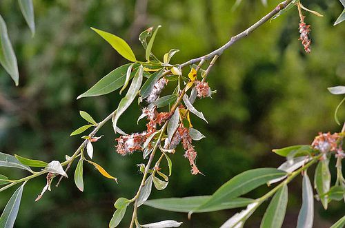 Ветви ивы длинные, блестящие, светло-зеленого оттенка, с ланцетовидными листиками. Край листика мелкопильчатый, а снизу он покрыт тонким слоем пуха. Цветки мелкие собраны в соцветия типа сережки. Плоды представляют собой коробочки.