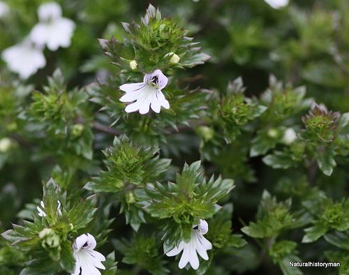Листья очанки довольно мелкие и расположены друг напротив друга, по форме напоминают яйцо, но края имеют зубцы. Цветки окрашены в белый или в светло – фиолетовый цвет. Они располагаются в пазухах листьев и имеют небольшой размер ( их длина от 6 до 10 миллиметров).