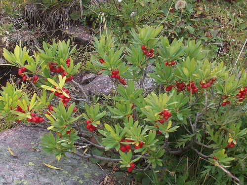 Этот невысокий кустарник, достигающий высоты полтора метра, входит в семейство Волчниковых. Его наполовину опушенные побеги покрыты листьями обратноланцетной формы. Верхняя поверхность листьев окрашена в сочный зеленый цвет, а нижняя имеет голубовато – серый оттенок.