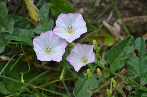 Цельнокрайние листья, длинной от 2 до 6 сантиметров и шириной – от 0,5 до 4, крепятся по спирали на многочисленных побегах длинными черешками. Все побеги вьюнка ребристые тонкие вьющиеся быстро оплетают растущие рядом растения.