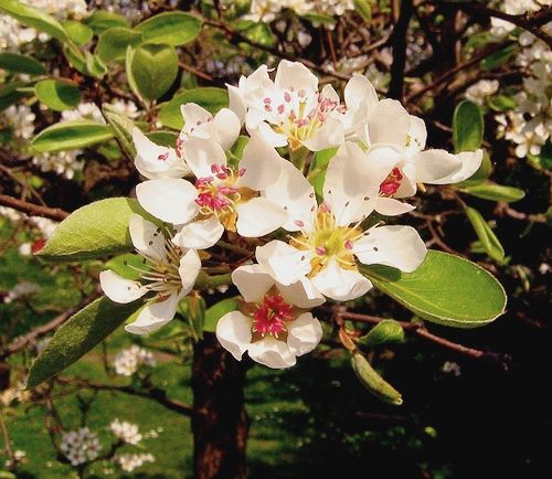 Белые или нежно – розовые цветки (диаметром почти 3 сантиметра) с большим количеством тычинок, одним пестиком и пятью столбиками. Желтоватые или зеленые плоды груши обыкновенной имеют либо почти шаровидную форму, либо грушевидную. Они прикрепляются к стволу и побегам длинными плодоножками.