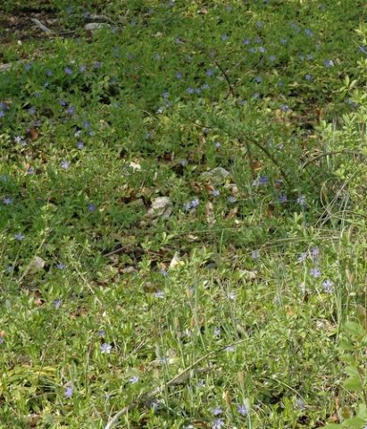 Вечнозеленое почвопокровное ползучее растение. Стебли ползучие, ветвистые легко укореняются, длина от 30 до 60 см. Листья расположены супротивно, эллиптической формы, зеленого цвета, блестящие гладкие кожистые сверху. Цветы голубые, светло синие или лавандовые, расположены по одному. Период цветения с мая до конца июня. Произрастает под кустарниками, по опушкам лесов и на степных склонах. Выращивается как декоративное растение.