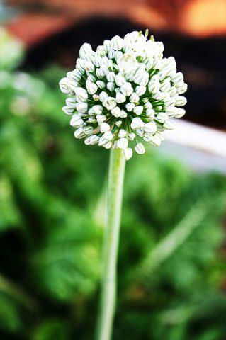 Цветки на коротких цветоножках, собраны в небольшой шарообразный зонтик, окрашены в белые или бледно – лиловые оттенки. Соцветие до начала цветения покрыто плотной пленкой, которая с первым раскрытым цветком разрывается и опадает. Цветение проходит с июля по август.